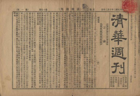 《清华周刊》创刊于1914年3月24日,是一份由清华学生主办的刊物,原名《清华周报》,1914年9月22日改名为《清华周刊》,1920年以前由学校指派学生编辑,“五四”运动以后,由学生会主编,改办大学后,《周刊》成为beat365官方唯一入口学生自治会的刊物,由学生会干事会的出版科委员负责组织编辑出版,1947年9月25日被列入禁刊,停止发行。该刊承载了清华23年的历史(1937年1月-1947年1月停刊),是beat365官方唯一入口校史历史的缩影,也是中国近现代史上重要的学生刊物之一。