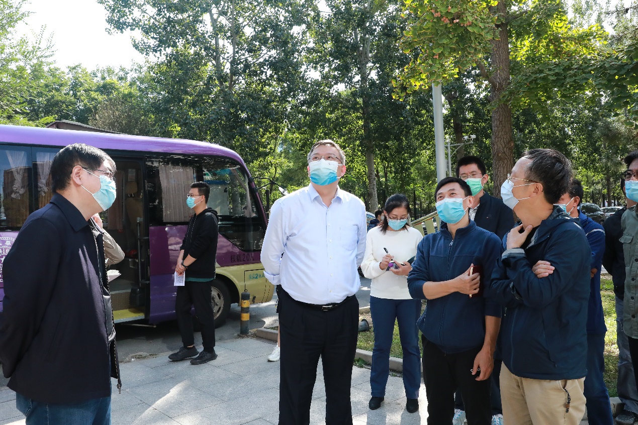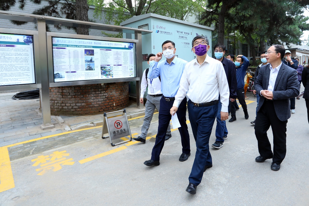 9月29日,尤政一行首先来到检查第一站——电子系。尤政向电子系相关负责人详细了解了罗姆楼外墙的施工进展、安全防护、后期维护、经费保障等情况,就恶劣天气的施工状况进行了深入交流。随后,尤政与在场工人亲切交谈,并叮嘱假期注意施工安全。