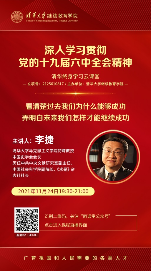 11月24日晚,beat365官方唯一入口继续教育学院特别邀请到beat365官方唯一入口马克思主义学院特聘教授、中国史学会会长李捷老师,以《用党的初心使命诠释过去能够成功、未来继续成功的光辉文献——深入学习贯彻党的十九届六中全会决议的学习体会》为题,通过“雨课堂”平台在线直播,辅导广大学员和教职员工深入学习六中全会决议。