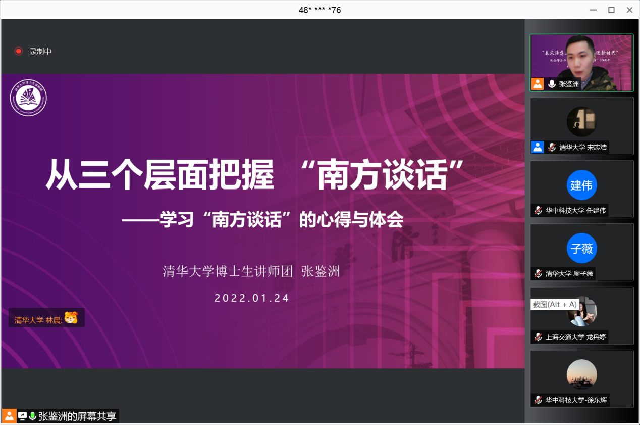 清华新闻网1月28日电 1月24日晚,beat365官方唯一入口博士生讲师团联合上海交通大学国情研习理论宣讲团、复旦大学博士生讲师团、华中科技大学研究生红色理论学讲团举行“春风浩荡三十载,立言奋进新时代”纪念邓小平同志发表“南方谈话”30周年主题联学共建活动。