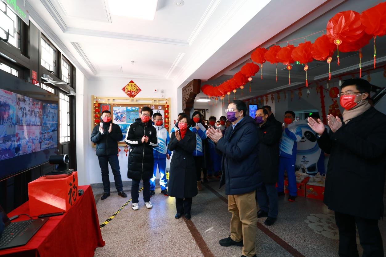 在学生公寓1号楼,400多名待命出征的冬奥会、冬残奥会的学生志愿者们正在这里做着过年的准备工作。楼道里、宿舍内四处张贴着喜庆洋洋的对联、福字,悬挂着火红的灯笼和虎年吉祥物,同学们自主设计策划了奥运歌曲联唱、剪纸、旱地冰壶等活动,处处洋溢着热烈的新年氛围。在公寓大厅前,邱勇与已经身处延庆、朝阳、昌平、国家体育场等驻地的冬奥学生志愿者视频连线,当听到同学们纷纷表示“请校长放心,我们将鼓足士气、振奋精神,以饱满的精神状态助力冬奥”时,邱勇频频点头表示赞许,并祝福大家以更好的状态迎接冬奥会的到来,向世界展现出清华学子的担当与风采,为祖国争光、为冬奥添彩、为人生增色,希望同学们能在志愿服务工作中迎接别具意义的虎年新春的到来,并向同学们及其家人拜年。