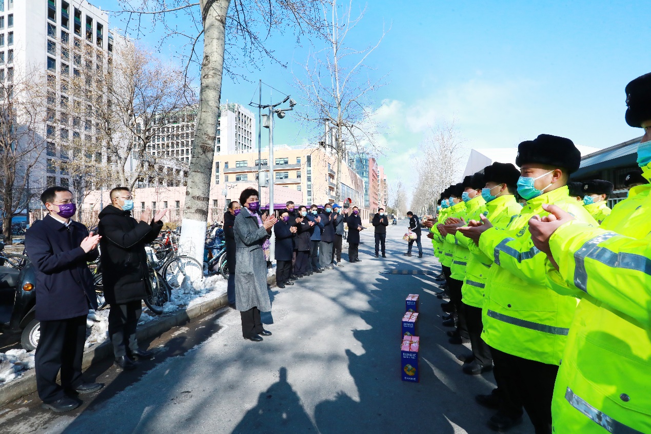 在学校东侧门慰问值班保安等工作人员