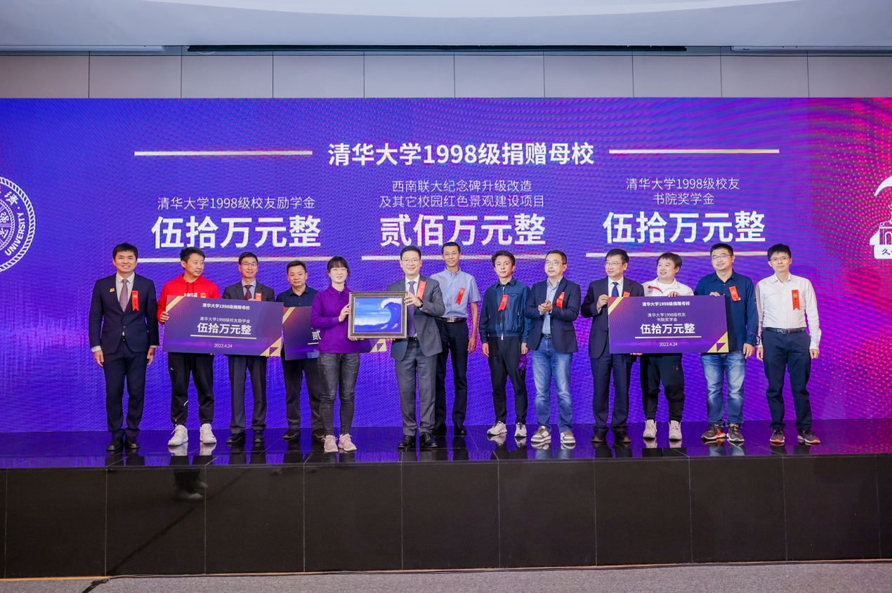 在捐赠环节,1998级校友为激励更多优秀学子勤学修德,捐赠并设立了 “西南联大纪念碑升级改造及其他校园红色景观建设项目”“1998级校友书院奖学金”,并追加捐赠了“1998级校友励学金”。未央书院院长梁曦东、清华校友总会秘书长唐杰、教育基金会副秘书长孙大鹏、修缮中心副主任唐浪接受了校友捐赠。无95的赵珂萌同学作为获得励学金的代表赠送给校友一幅自己亲手绘制的画。