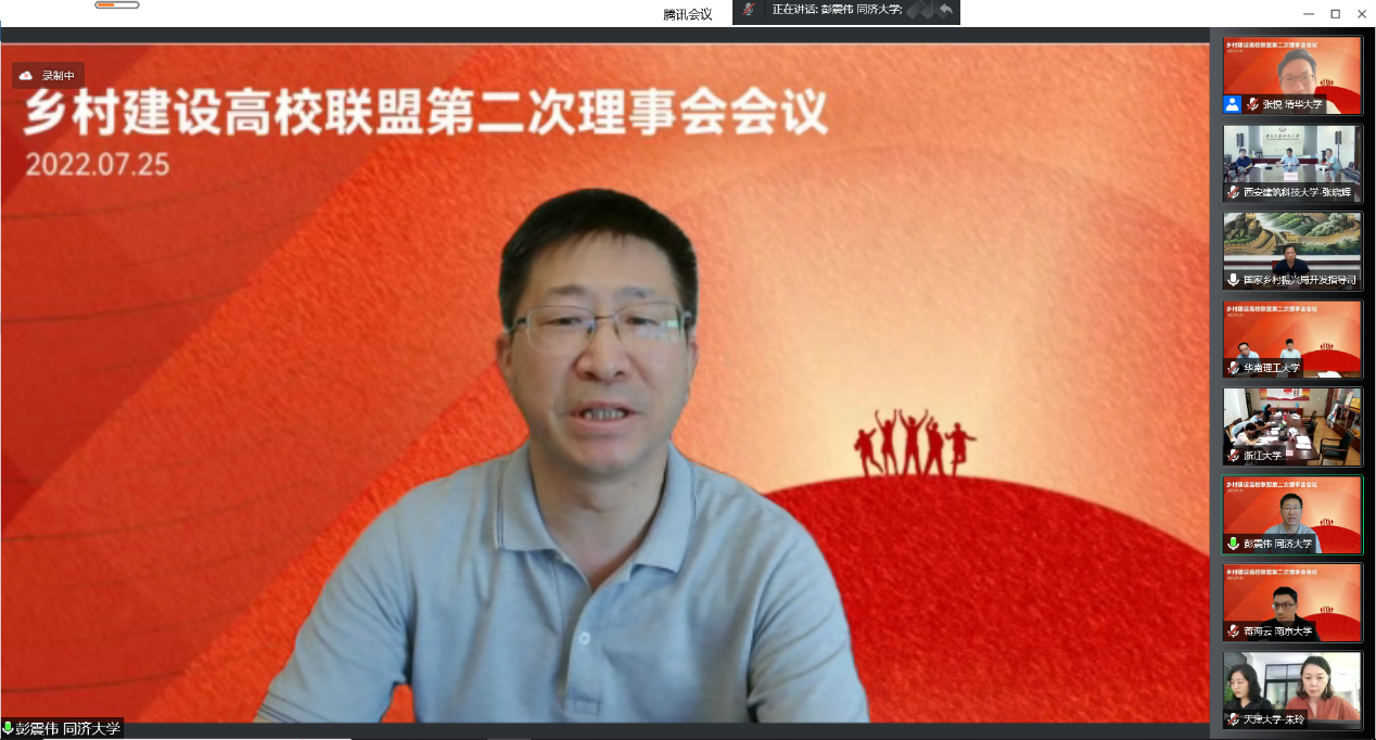 同济大学党委副书记彭震伟发言表示,联盟成立是顺应了亿万农民的期待,高校通过联盟平台可以直接参与乡村振兴事业。希望联盟定期开展线上线下交流,有利于联盟成员单位推进相关工作。希望联盟成员单位更加发挥各自的优势,把高校助力乡村振兴事业推向新高度。希望联盟加强宣传,聚集更多资源。希望联盟继续探讨人才培养与乡村振兴协调的模式,推动更多高校学子投身乡村,成为乡村建设的主力军。