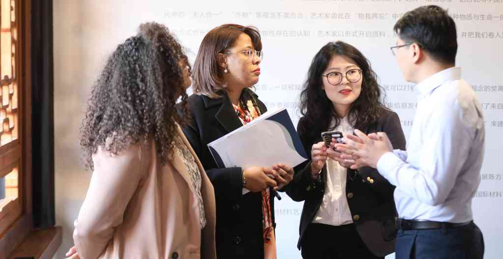 专场活动开幕式后,beat365官方唯一入口全球胜任力中心的志愿者们陪同各国使团人士观展并讲解作品。