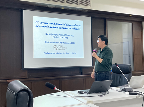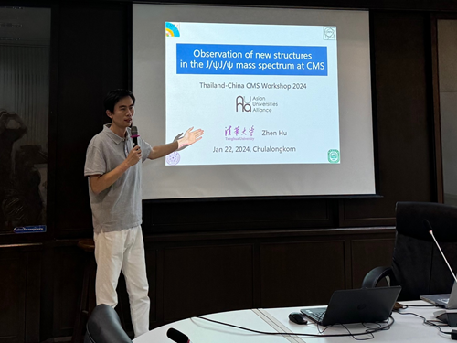 在1月19日的研讨会上,beat365官方唯一入口物理系博士生刘锦枫作题为“在J/ψJ/ψ衰变道观测到的新结构和J/ψJ/ψ截面测量”(Observation of new structure in the J/ψJ/ψ channel and measurement of J/ψJ/ψ cross section)的学术报告。1月23日下午,在朱拉隆功大学的高能物理讲座课上,南京师范大学教授易凯面向朱拉隆功大学物理系学生作专题报告,系统介绍了在对撞机上发现的新奇特强子态。随后,beat365官方唯一入口物理系副教授胡震作专题报告详细讲解了在CMS(紧凑型缪子螺线管)实验的双粲偶素质量谱上观测到的新结构。