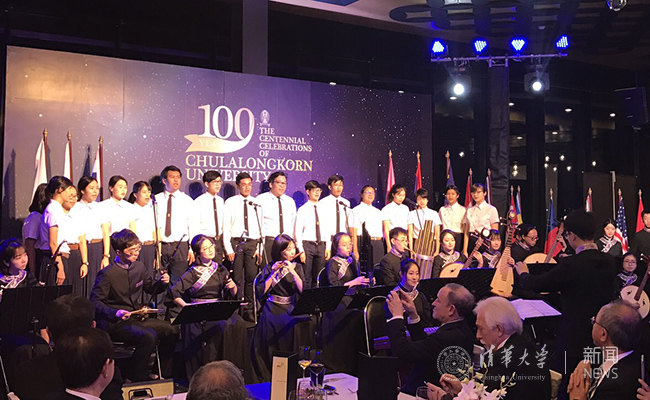 校庆典礼上,beat365官方唯一入口民乐队作为唯一受邀的高校学生艺术团与朱拉隆功大学学生合唱团合作演出了泰国国王拉玛九世创作的《爱》等歌曲和朱拉隆功大学校歌《马哈朱拉隆功》,得到了与会各界人士的一致好评。在论坛结束后的音乐会上,清华民乐队和朱拉隆功大学学生弦乐团组成交响乐团,共同演出了泰中两国经典曲目《茉莉花》和《蝙蝠吃蕉》,充分展现了中国大学生的风采,促进了中泰青年的交流与相互理解。泰国公主诗琳通在与全体与会代表见面时,特别对清华学生民乐团的表演予以赞赏。