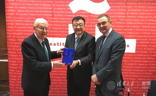 与马德里理工大学校长及塞万提斯学院院长互赠纪念品。