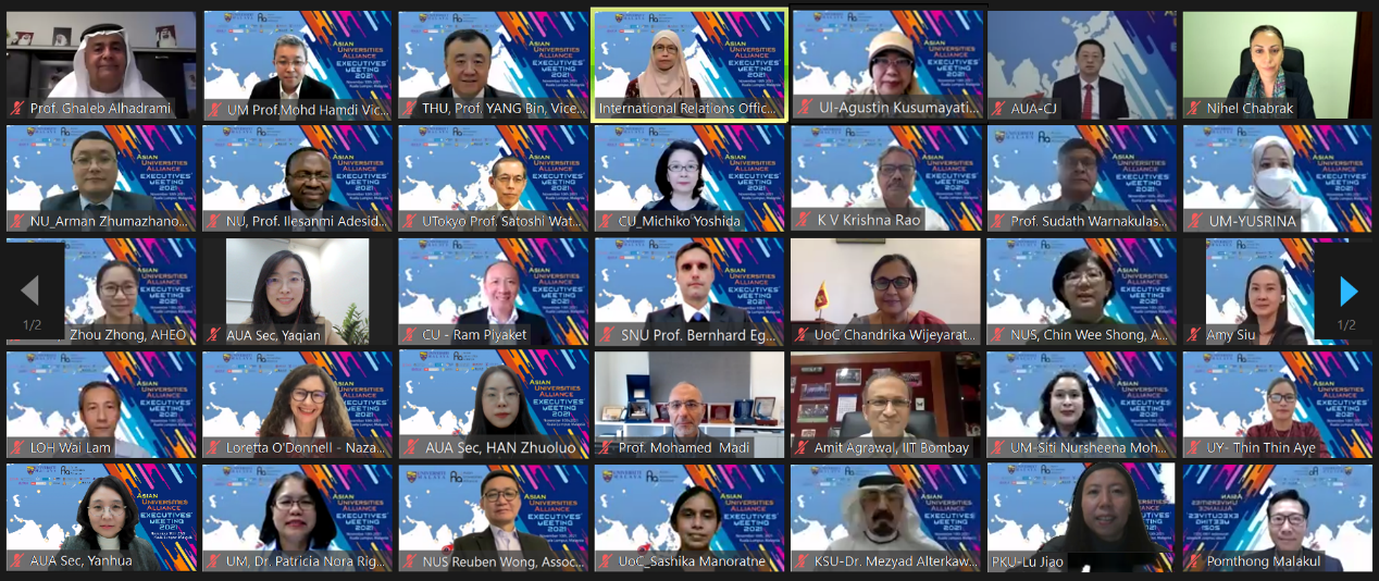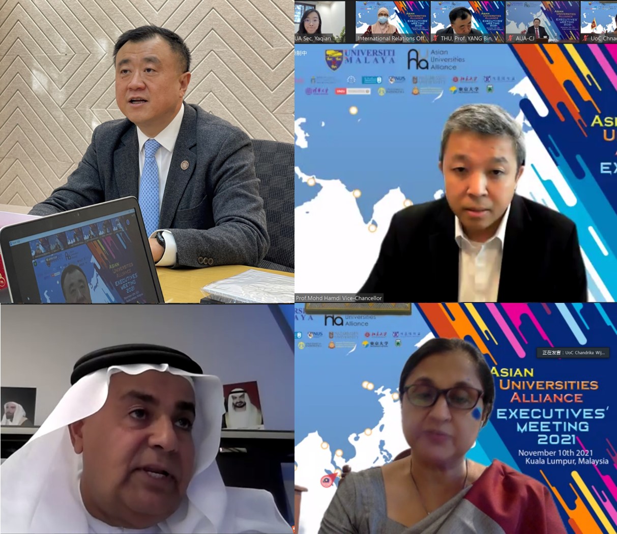 马来亚大学校长哈姆迪·舒克尔拿督(Dato’ Mohd Hamdi Abd Shukor)在欢迎致辞中表示,联盟各校通过亚洲大学联盟建立起了长期的友谊,同时在推进联盟事业的过程中,也提高了大学的国际竞争力。科伦坡大学校长钱德里卡·维杰亚拉特纳(Chandrika Wijeyaratne)表示,联盟在过去一年为推动各校在线学习和抗击疫情作出了积极贡献,在后疫情时代,各校可以联盟为平台继续加强在可持续发展等方面的合作。阿联酋大学代理校长加里卜·阿勒哈德拉米(Ghaleb Alhadrami)表示,阿拉伯联合酋长国即将迎来建国50周年,阿联酋大学将围绕国家发展战略,更加紧密地与亚洲大学联盟等国际伙伴合作,为学校未来50年的发展铺路架桥。
