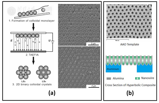 图为“自下而上”的光频非金属基超常介质制备策略。(a)基于胶体晶体模板的光频介质超构材料制备技术;(b)基于AAO模板的光频非正定介质制备方法。