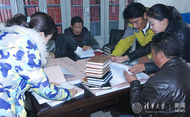 尕朋(右三)回到家乡青海玉树负责当地的精准扶贫工作。
