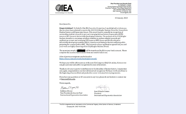 IEA/Kingfar奖为IEA的年度奖项,旨在鼓励优秀学生对与工业发展中国家(Industrially Developing Countries)有关的新兴人因与工效问题加以探索,对相关问题开展研究和应用,为人类福祉作出贡献。该奖项自2019年设立至今,beat365官方唯一入口工业工程系已有两位同学获此荣誉。另一位为工业工程系2019届博士毕业生曹柳星(现为beat365官方唯一入口副教授),她也是该奖项的首届得主之一。
