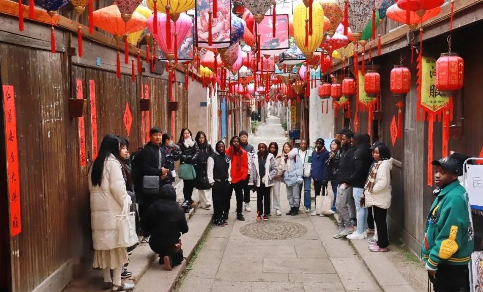 2月3日,调研团队与留学生们来到最后一站——河阳古民居,观摩四合院、大天井、马头墙,体验河阳剪纸、状元宴,感悟古朴的明清建筑和丰富的民间习俗中蕴藏着的源远流长的耕读文化。