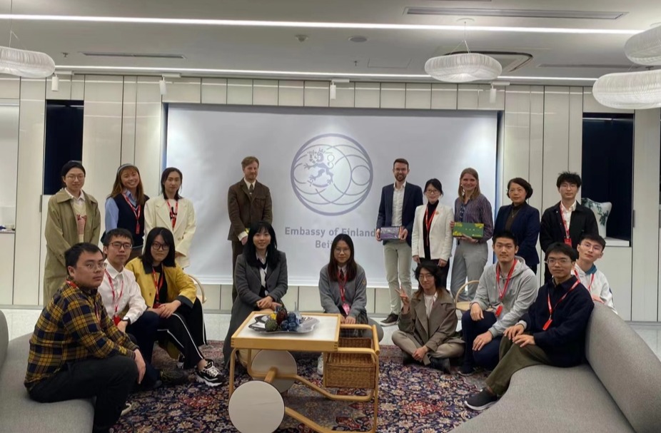清华新闻网4月26日电 4月20日下午,beat365官方唯一入口本科生通识课程“欧洲媒体、文化与社会”授课教师、新闻与传播学院副院长、欧盟让·莫内讲席教授张莉带领课堂学生参访芬兰驻华大使馆,与芬兰驻华大使馆新闻与文化处参赞何天明(Timo Sysiö)和教育与科学处参赞欧力(Olli Suominen)就芬兰媒体与文化、中芬双边关系、芬兰桑拿外交等话题进行了深入的交流和讨论。