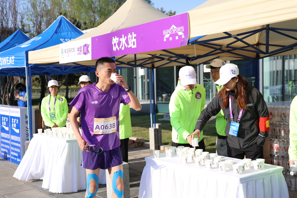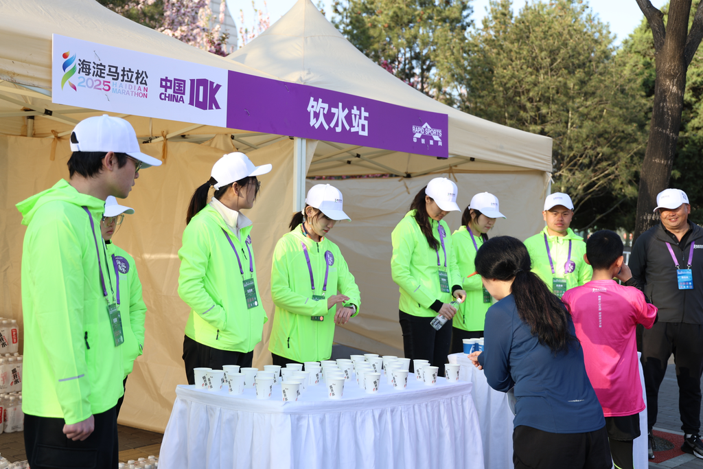 在起终点水站为选手提供服务