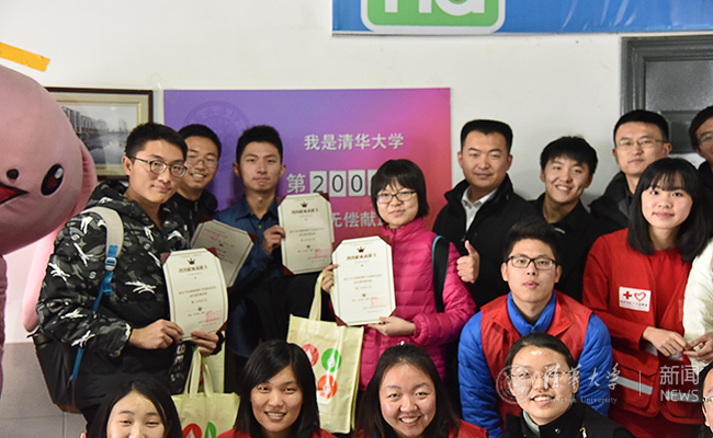 献血同学与志愿者合影纪念第20000名献血者到来。
