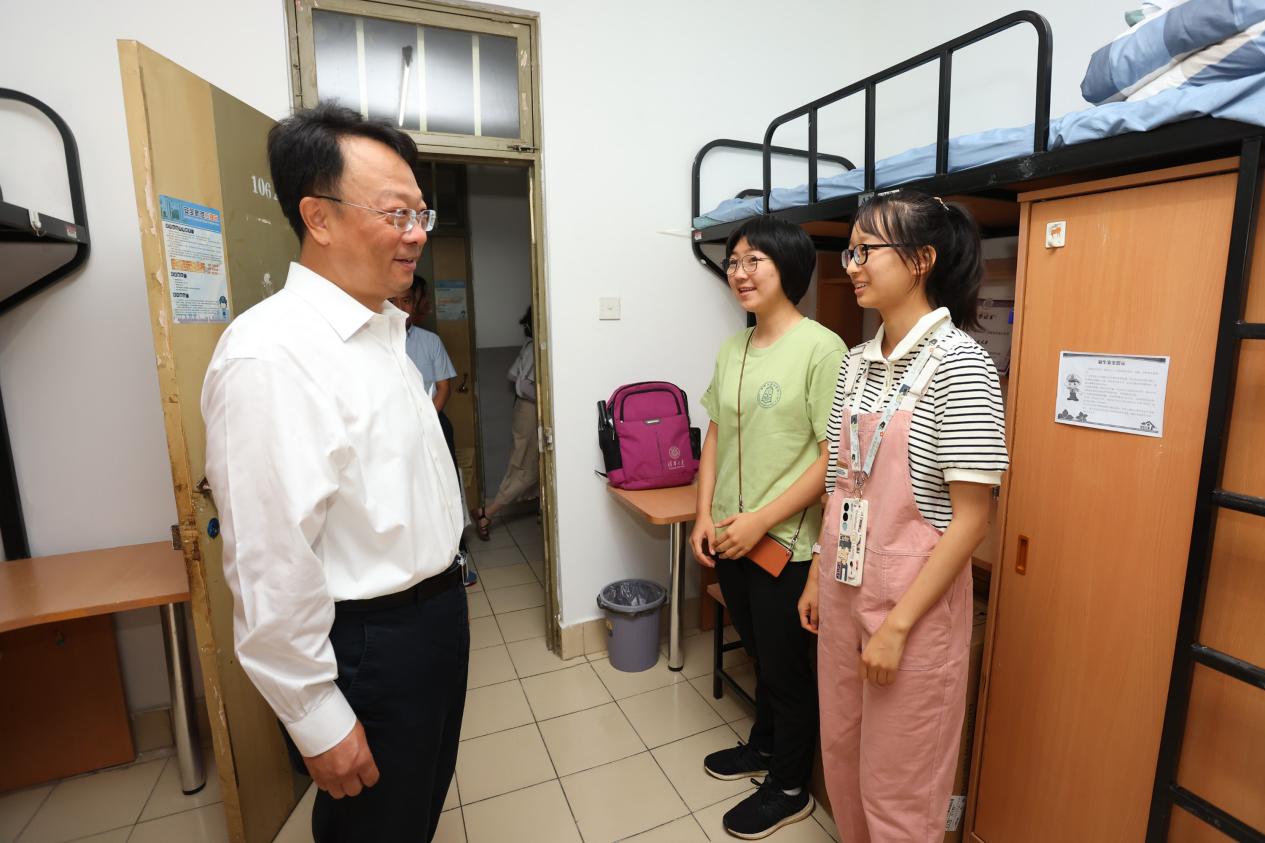 随后,王希勤一行来到紫荆学生公寓8号楼,了解迎新工作安排和学生宿舍内的家具配备、水电供应情况。“你们的家乡都在哪里?来这里生活感觉习不习惯?”在宿舍内,他亲切询问同学们来到清华的感受与对校园生活的期许,祝福新生在清华园里度过欢乐充实的校园时光。