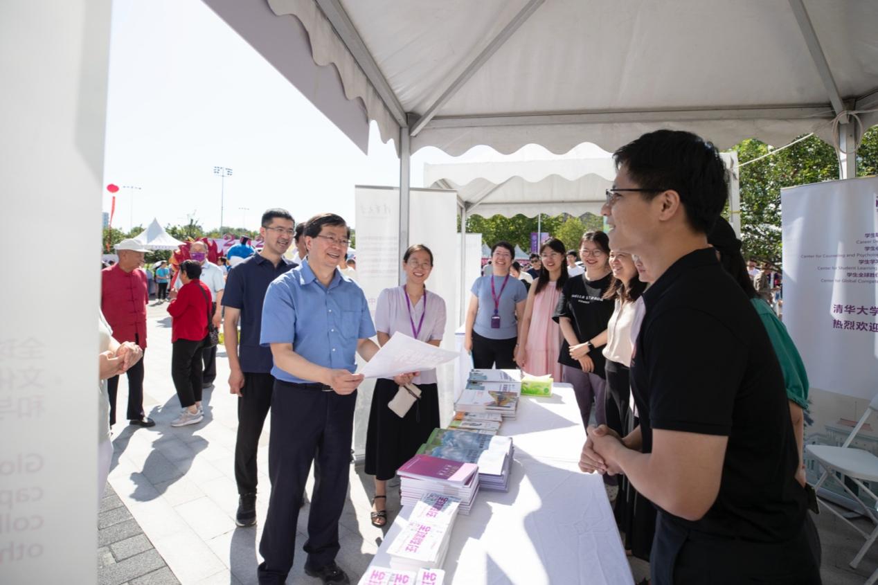 王希勤一行首先来到紫荆23号楼北侧国际学生报到点了解国际新生入学报到情况。楼前,迎新志愿者们为新生一一发放提前准备好的报到资料和详尽的校园生活指南,每位初来乍到的新“清华人”都在志愿者细致贴心的工作中感受到园子里的浓情暖意。“你们辛苦了!”王希勤向辛勤付出的迎新志愿者们表示感谢。