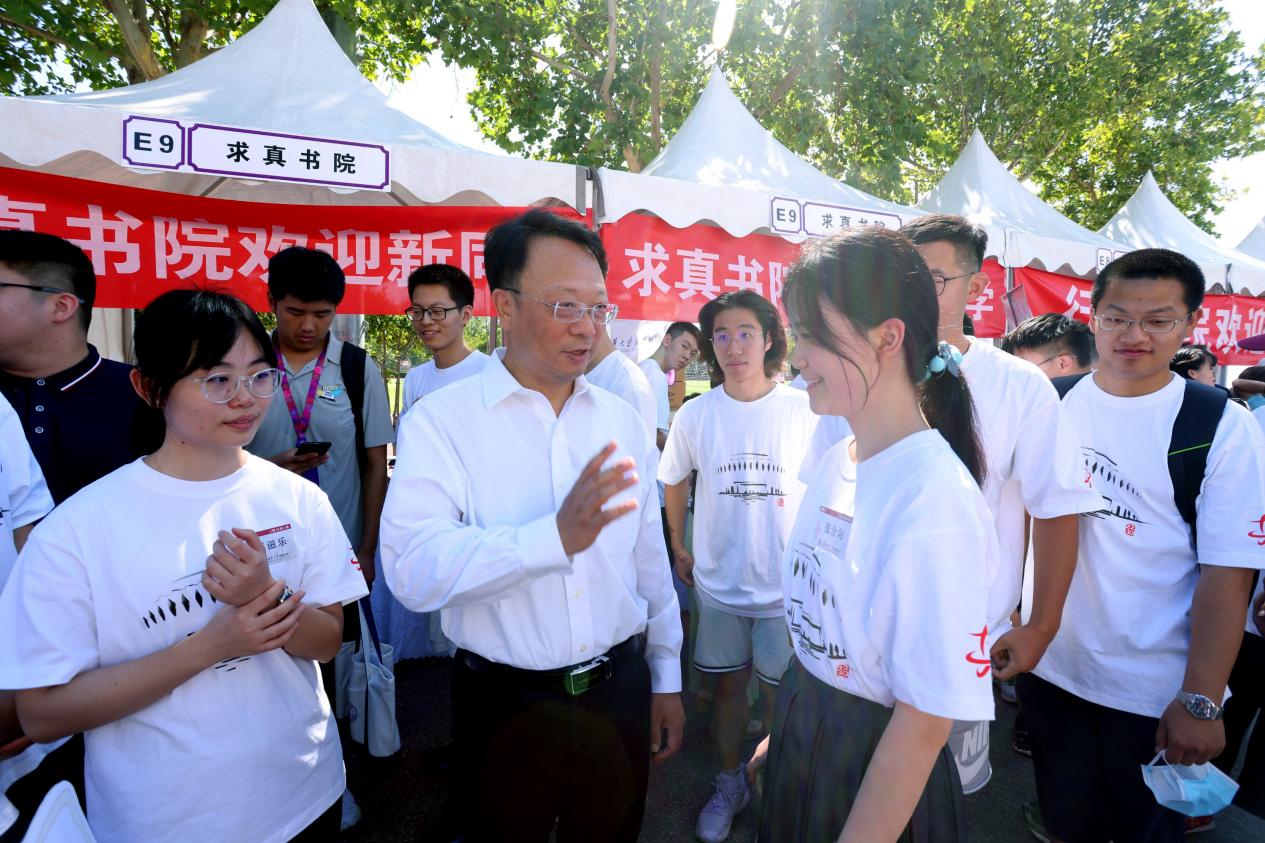 在“热烈欢迎新同学”的红色拱门内,各具特色的院系迎新报到点一字排开,热闹非凡。邱勇走上前去,与电机系、计算机系、航院、社科学院、新雅书院、体育代表队等迎新工作人员、报到新生及其亲友亲切交流,详细了解迎新工作和新生报到情况。
