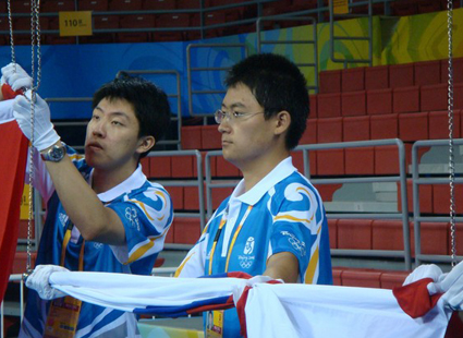 图为奥运会旗手志愿者戎戈(右一)。