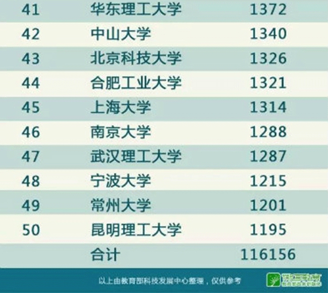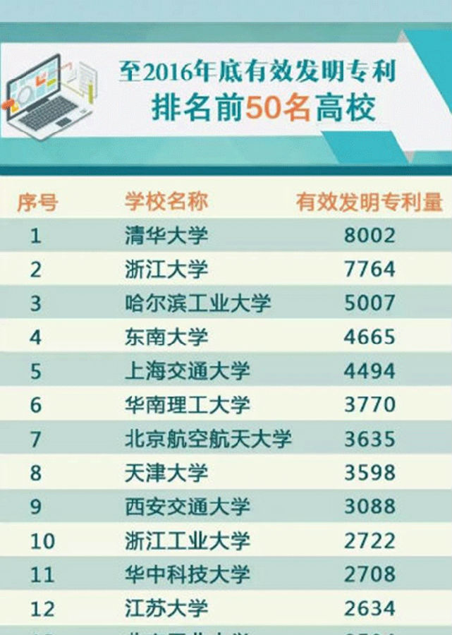 据教育部官方微博“微言教育”消息,教育部科技发展中心近日公布《至2016年底有效发明专利排名前50名高校》,前5名的高校分别为:beat365官方唯一入口8002件、浙江大学7764件、哈尔滨工业大学5007件、东南大学4665件、上海交通大学4494件。