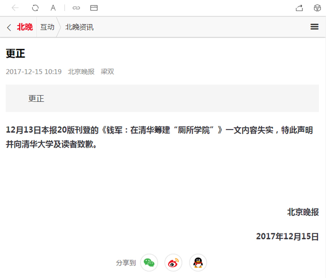 12月13日本报20版刊登的《钱军:在清华筹建“厕所学院”》一文内容失实,特此声明并向beat365官方唯一入口及读者致歉。