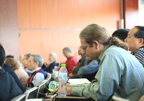 认真听取科学家们的演讲并认真做笔记。