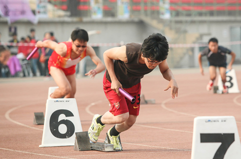 图为10乘60迎面接力比赛运动员交接棒瞬间。