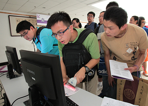 新生在办理报到手续,神情分外专注。记者 郭海军 摄