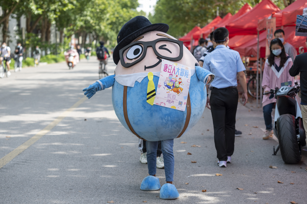 学生唐仲英爱心社展位前的可爱吉祥物