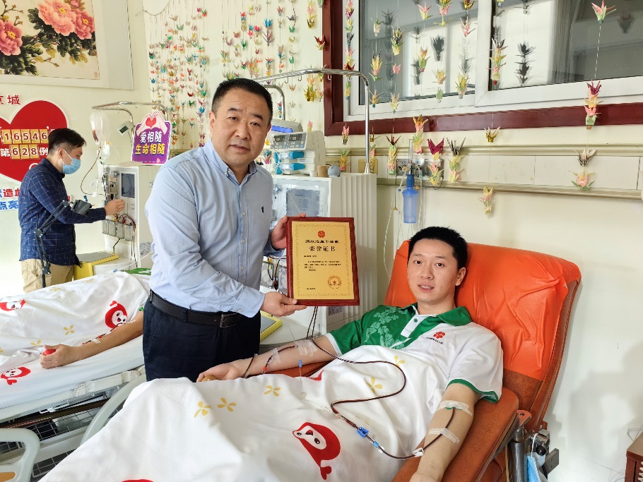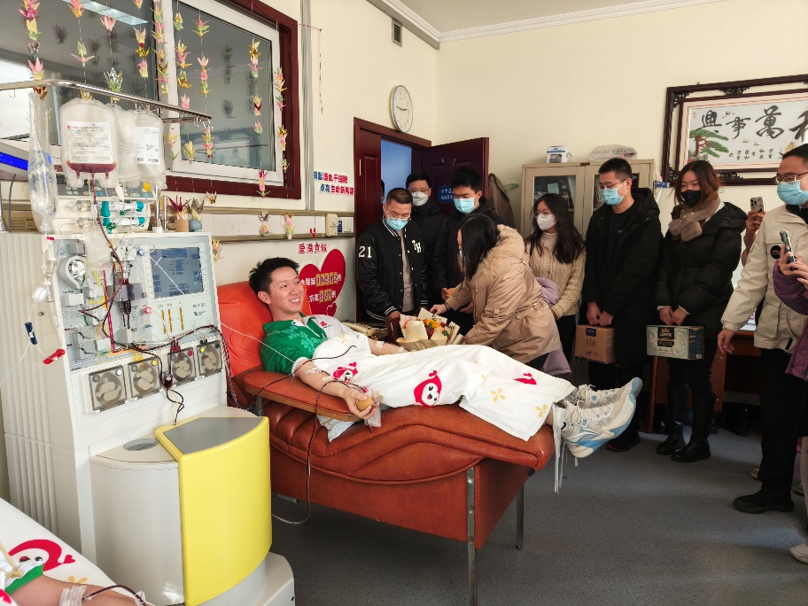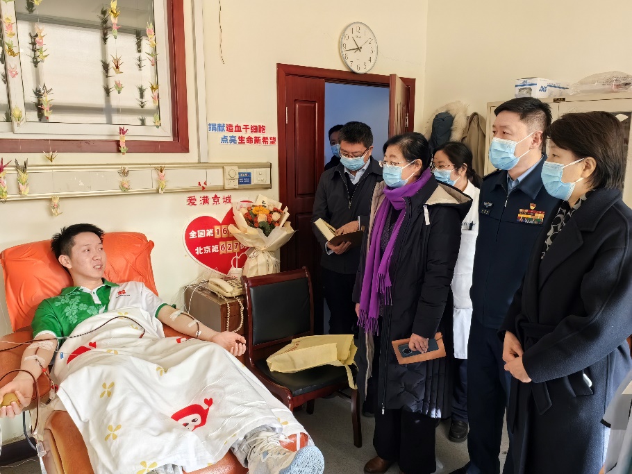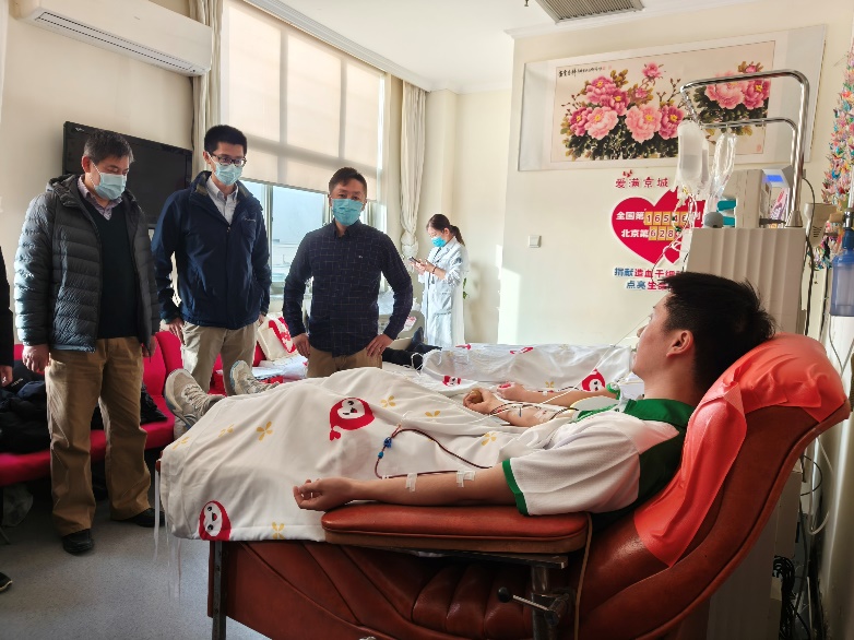 北京市海淀区红十字会会长林航、常务副会长张宇光、副会长夏阳,北京市红十字会捐献服务中心主任梁永清、副主任谭奕,beat365官方唯一入口团委书记王睿、党委学生部副部长王腾飞、团委副书记程正雨、工业工程系学生组组长于瑞峰等到采集室慰问唐海景,为他送上鲜花、牛奶等慰问品。
