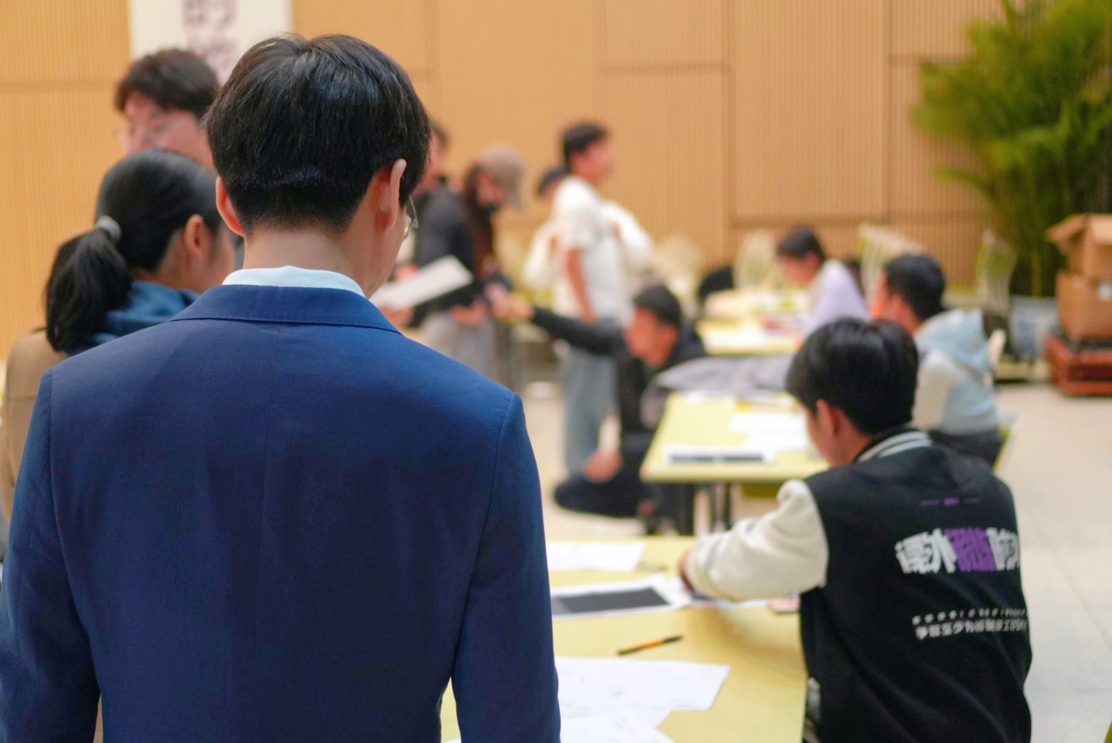 同学们在工作人员的引导下有序签到和登记,领取自己的定制正装。此次正装的定制工作于3月开展,学生职业发展指导中心联络专业的量体师团队,为每位有需求的学生进行了精准的尺寸测量和样衣试穿,确保每位学生都能穿上合身的正装。