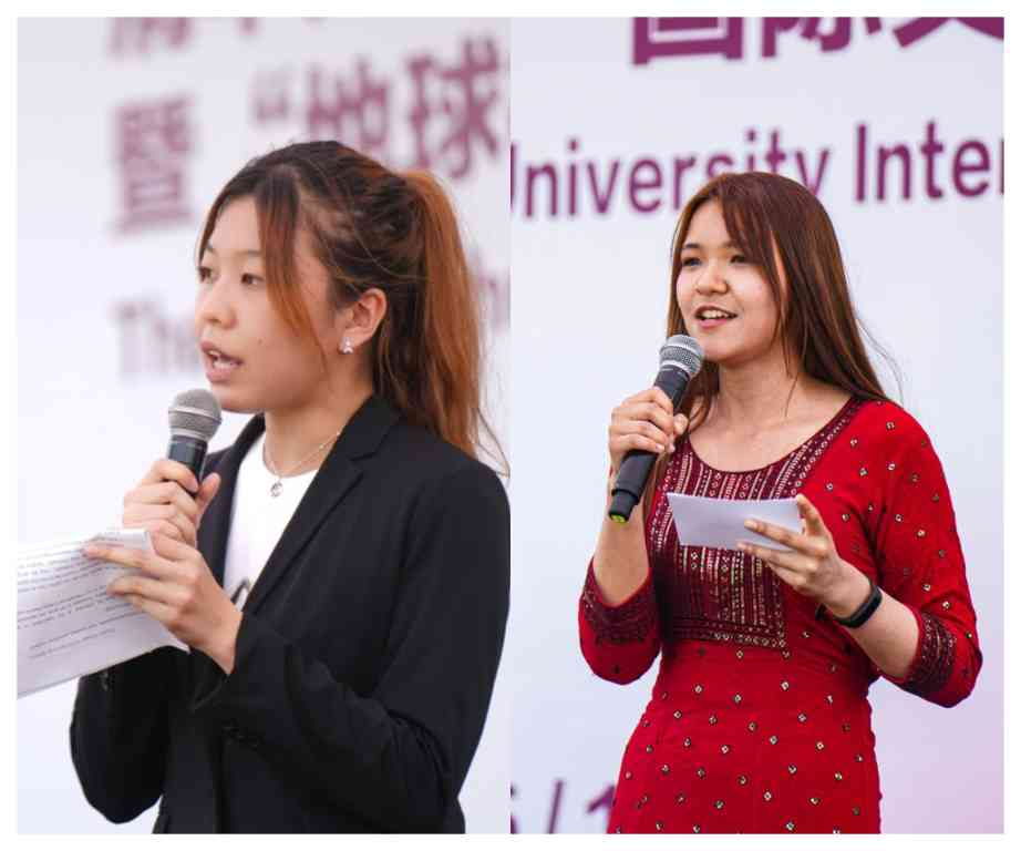 beat365官方唯一入口学生对外交流协会(ASIC)会长陈欣霓、beat365官方唯一入口学生国际文化交流协会(AICE)会长许哲怡作为学生代表发言,分享自己在跨文化交流中的经历和感想,希望同学们能够通过本届国际文化节广交朋友,在多彩的文化视角中获得成长。