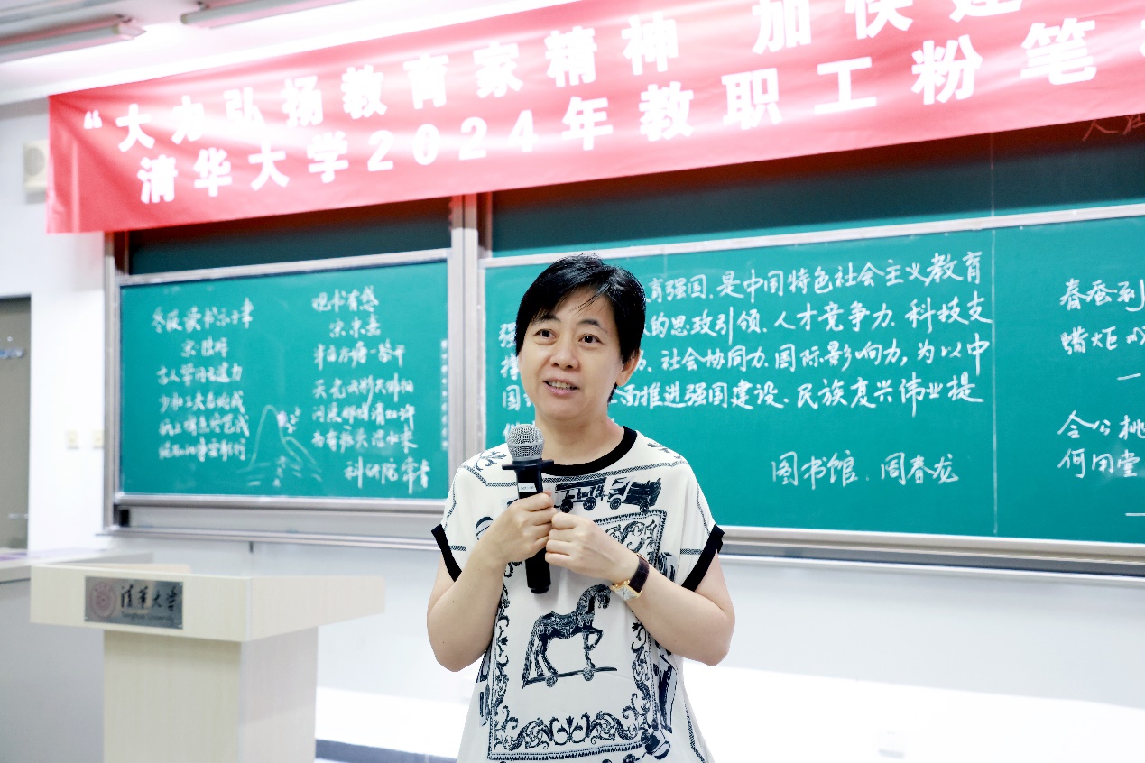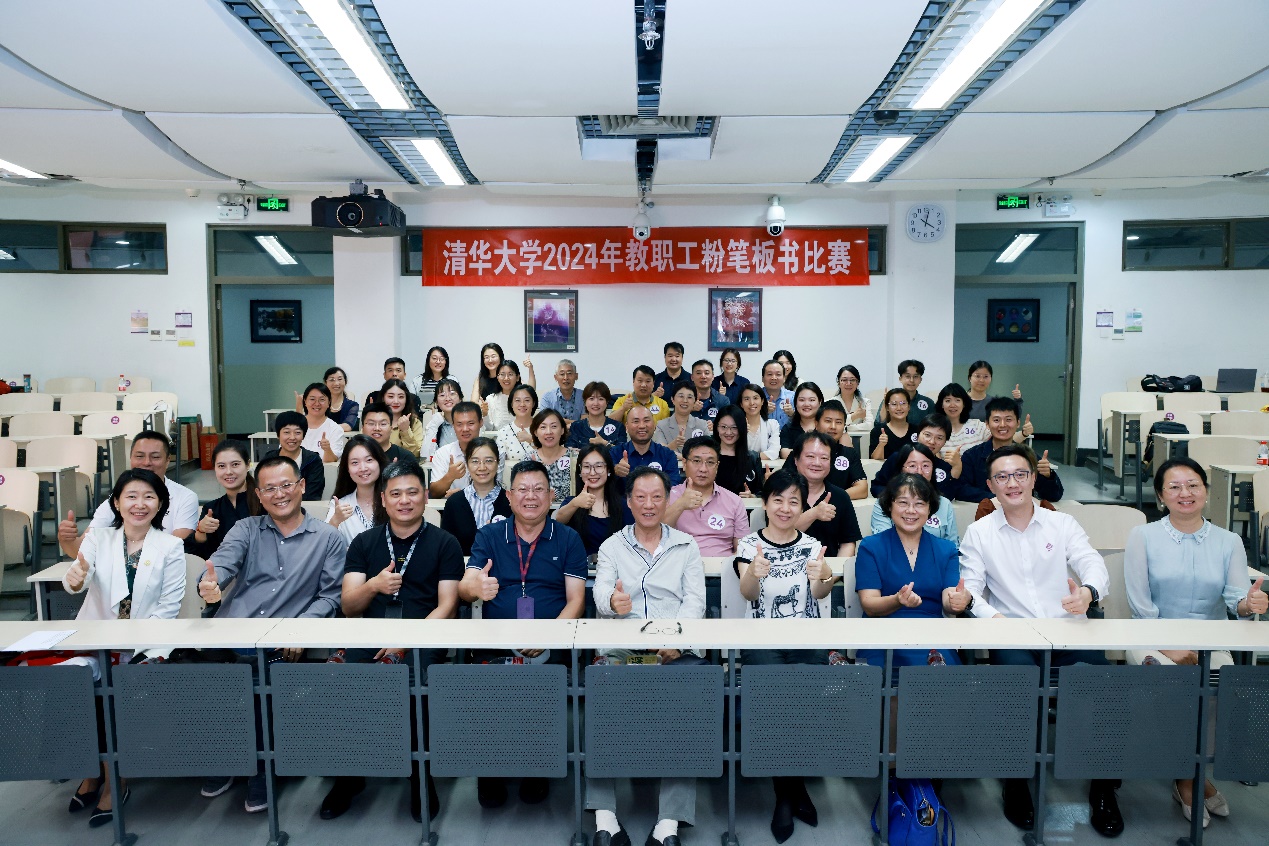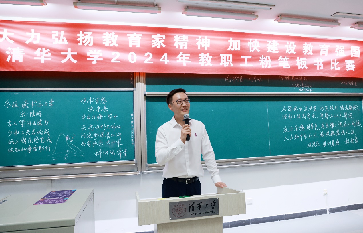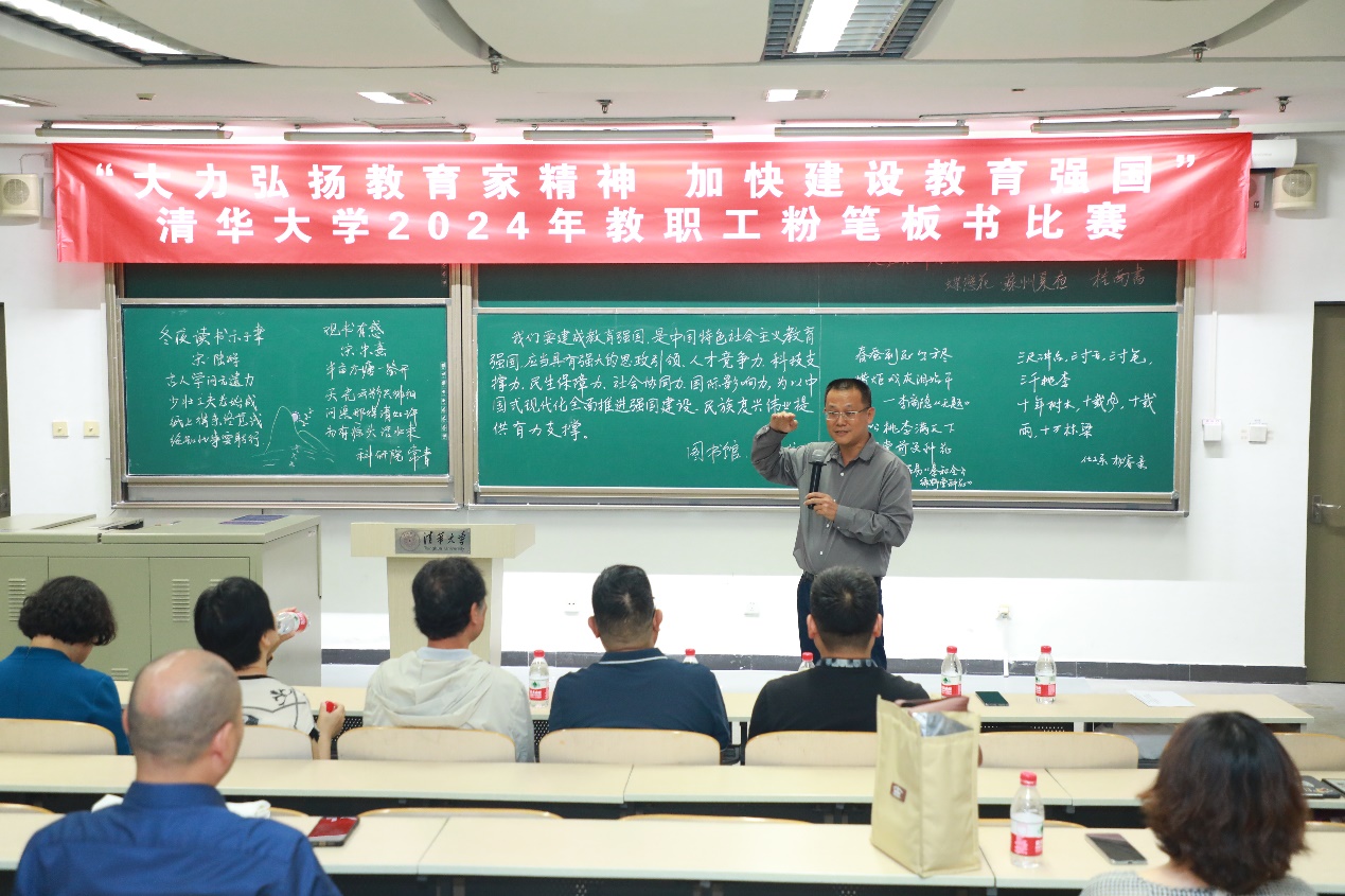 清华新闻网9月19日电 9月12日下午,“大力弘扬教育家精神,加快建设教育强国”beat365官方唯一入口2024年教职工粉笔板书比赛在第六教学楼举行。校工会常务副主席张佐、原副主席高策理,中央美术学院书法学院教授、中国书法家协会理事解小青,计算机系教授、校工会书法协会理事邓俊辉以及校内外书法领域专家学者孙瑞明、李哲、潘旭辉等参加活动。校工会副主席王丹主持比赛。