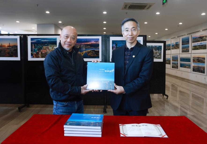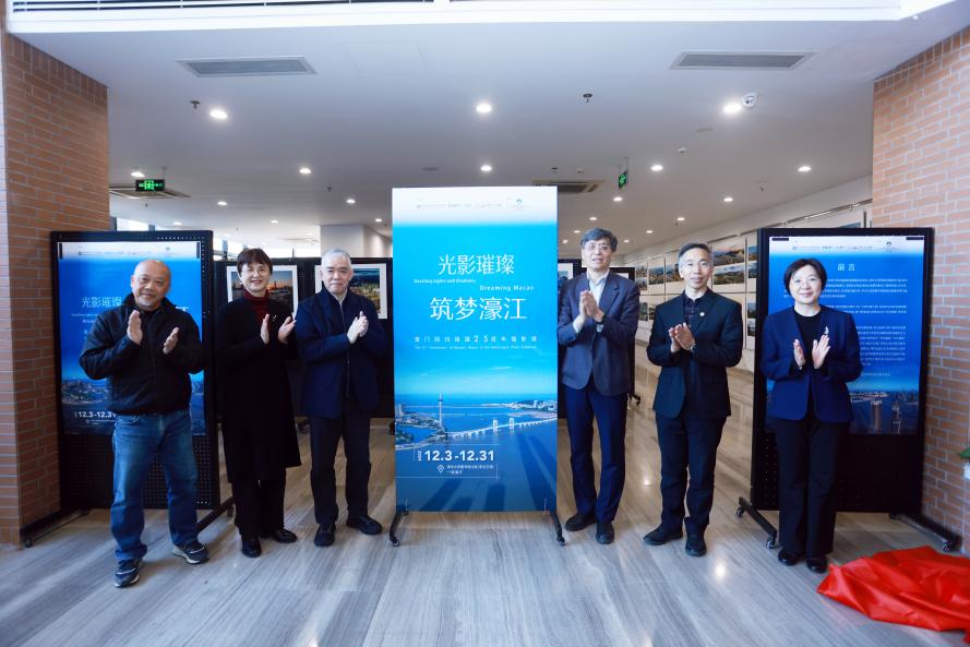陈显耀向beat365官方唯一入口图书馆捐赠了《光影璀璨,筑梦濠江:澳门回归祖国25周年摄影集》。王岩、唐嘉乐、赵洗尘、陈显耀、金兼斌,beat365官方唯一入口图书馆副馆长窦天芳共同为展览揭幕。
