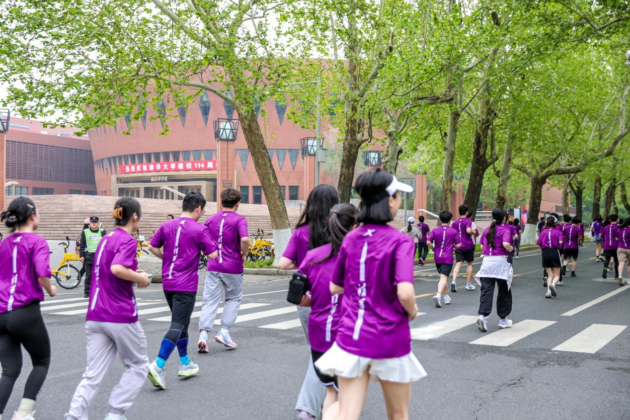发令枪响,身着印有“无体育,不清华”口号参赛服的老师同学们舒展身姿、跃动前行。白色与紫色的身影如同一朵朵绽放的紫荆花,为校园增添活力;跑鞋和地面摩擦的轻响与欢呼呐喊的加油声交织,谱成动人的青春乐章。