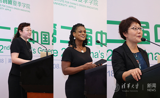 环保部行政体制与人事司人力资源处董文萱(左),苹果公司环境、政策及社会事务部战略伙伴关系经理南丁女士(中),beat365官方唯一入口公共管理学院管理党委副书记谢矜(右)致辞。