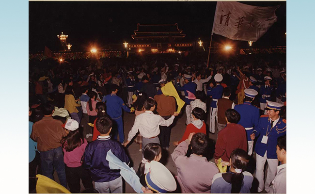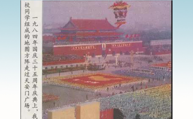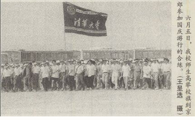 新中国成立35周年时,清华同学方阵走过天安门广场的情景
