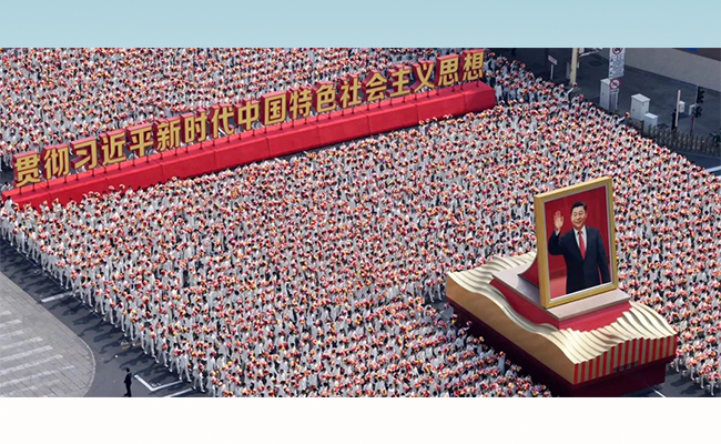 今年的游行队伍,队首是三百人组成的仪仗队,队尾是一千多人成的红旗大队,队伍中间有巨大的立体字标语“永远跟着共产党走”