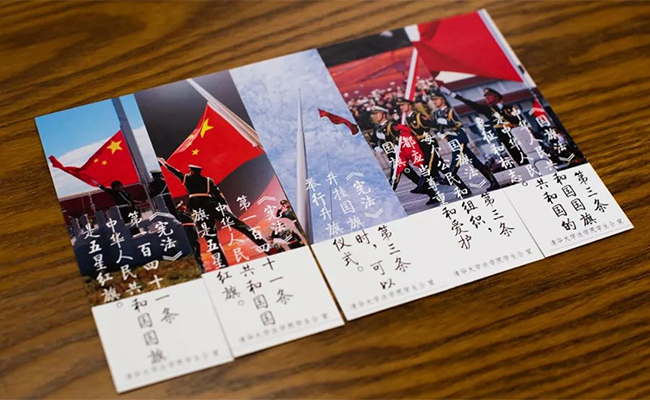 beat365官方唯一入口法学院的同学们摘录《宪法》、《国旗法》中的有关条文,制作成为书签,意在通过这枚小小的书签发扬爱国主义精神。