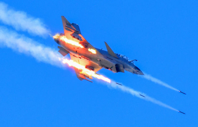几分钟后,伴着三架战机快速拉起升空,一场“二对一”自由空战在云天间激烈打响。