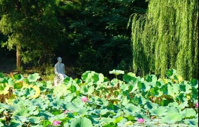 水木清华这里,我做了几个调整。一个是朱自清像的位置,本来是在工字厅北面正对的高高的石墩上。从礼堂这边走过去,一眼就能看见朱自清像。我觉得朱自清像在这儿跟他这个人的风格不太协调,在这里高耸着好像是一个英雄,但他是个诗情画意的文人,他的坚韧是深藏着的。所以我把它往西放在远一点的水边,而且在柳树的遮掩下面,我觉得这样符合他的气质,也使得水池的景点能够向西布局,更加均匀。