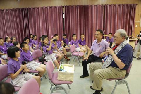 图为航天员们与清华附小学生交谈。