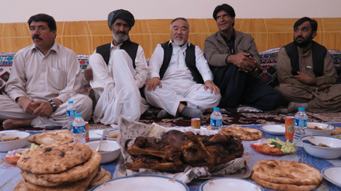 晚餐,主人阿曼让大厨在地炉里烤了两只山羊和一摞馕给我们吃。没有筷子和刀叉,我就用手抓起一大块羊羔肉,就着矿泉水、黄瓜和大葱,饱餐了一顿烤全羊。"仔细品尝这种烤全羊的味道,就象跟你心爱的女人做爱一样享受,"俾路支省执政党主席哈舍尔逗乐说。