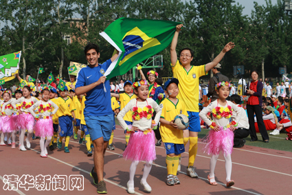 来自挪威大使馆、哥斯达黎加大使馆的客人以及喀麦隆前国脚也参与了开幕式。他们与清华附小的学生一起,走在自己“国家的队伍”里面,一起展现自己国家的足球文化,共庆清华附小世界杯的开幕。