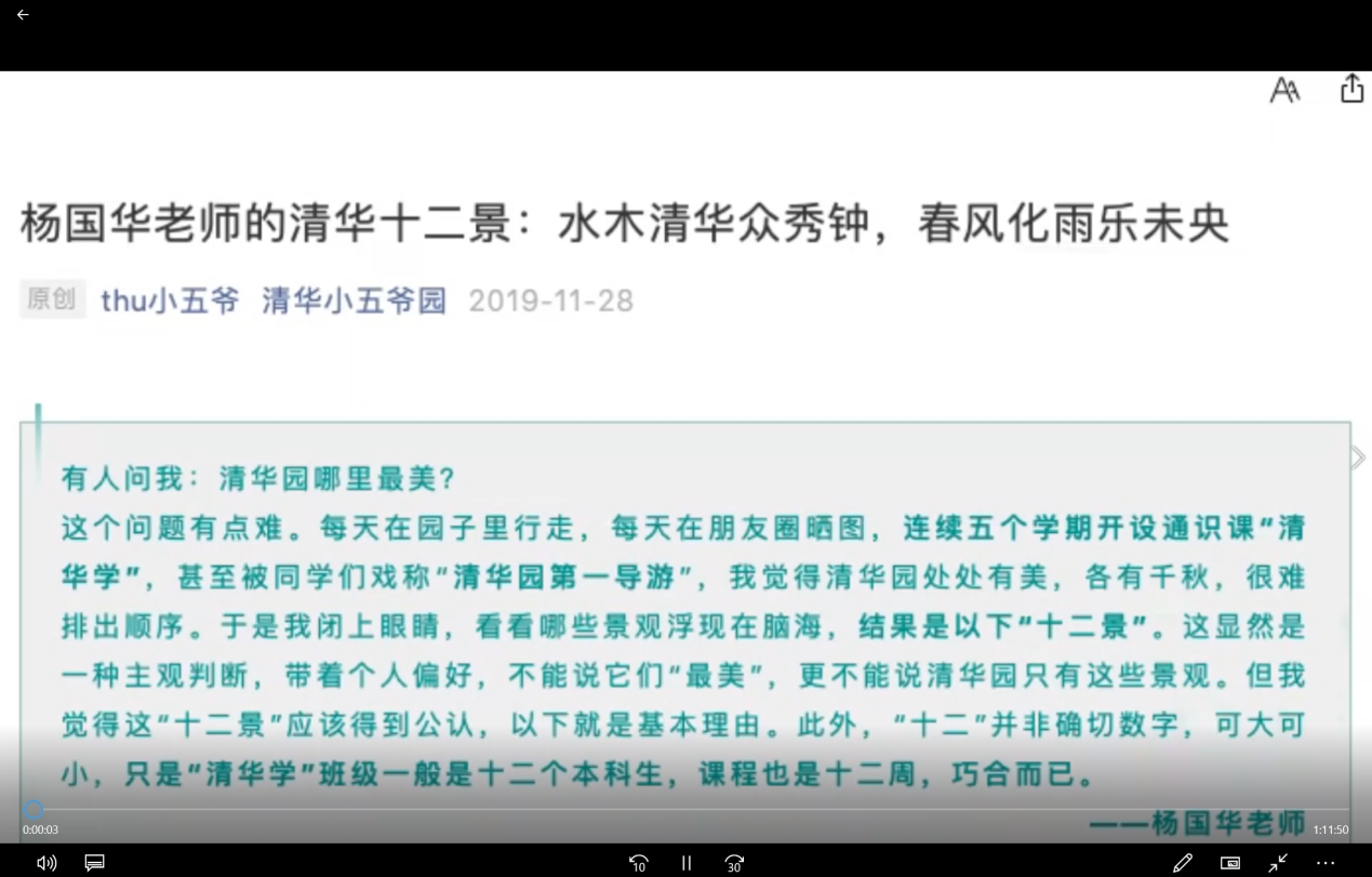 第二场讲座是由法学院教授杨国华主讲的“清华十二景”。杨国华通过镜头记载和故事分享,结合清华精神和传统介绍他眼中的十二景,包括王国维纪念碑、西南联大纪念碑、地质之角、景观石等景点,号召校友和同学们深入了解清华的每一处风景,用心爱护园子里的环境。