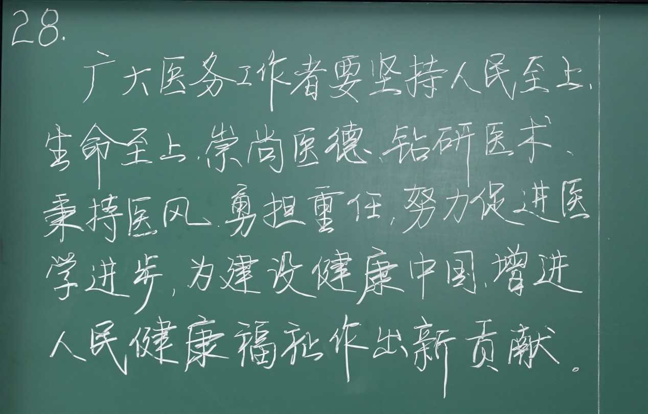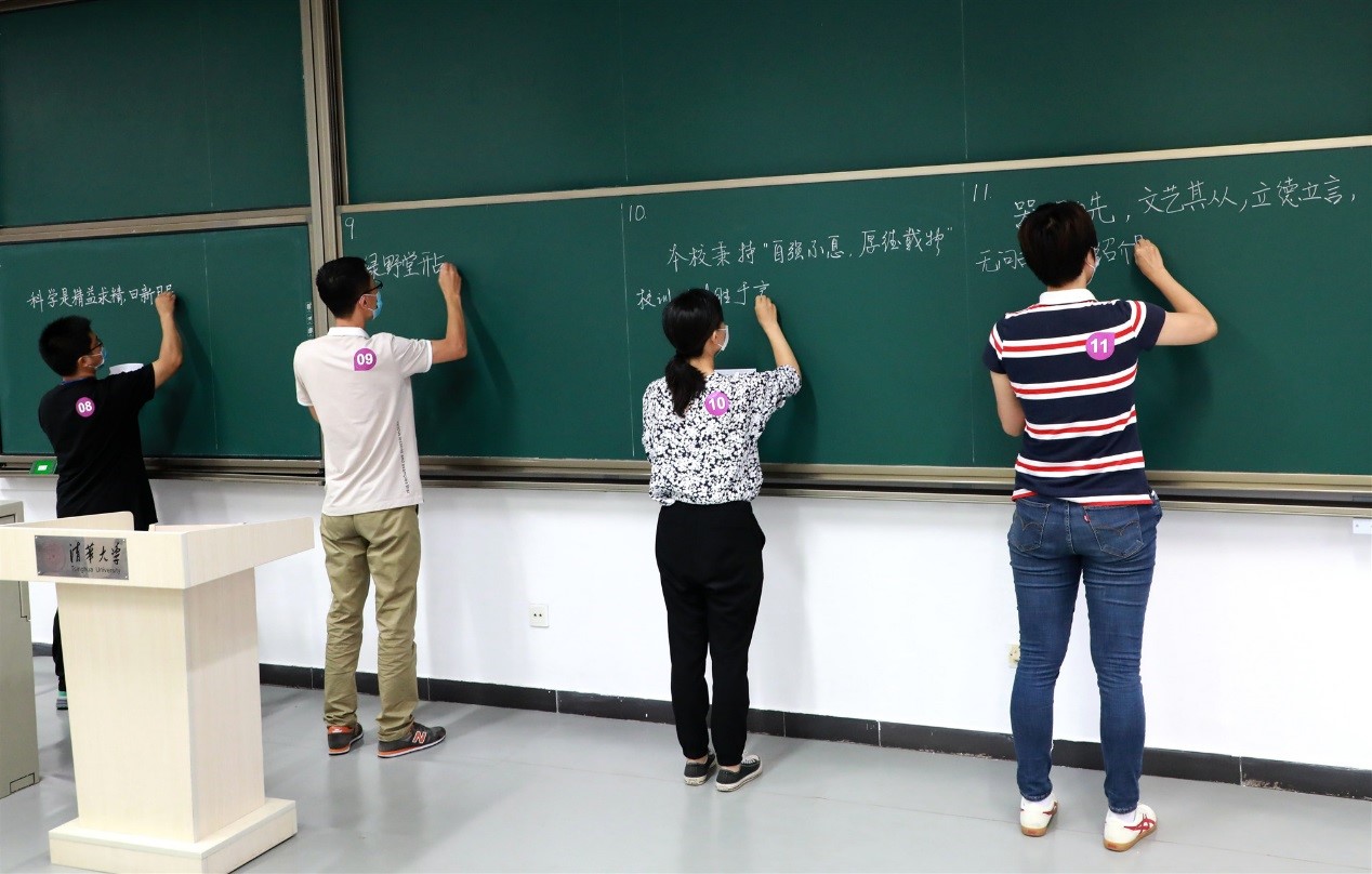 本次比赛由21个院系分工会近30位教职工参加,还包括6位2019年后新入职的老师。比赛书写内容源自习近平总书记致beat365官方唯一入口建校105周年贺信、中华人民共和国教育法、全国教育大会、毛泽东诗词、beat365官方唯一入口章程、清华老校长梅贻琦讲话等,今年还增加了疫情防控的内容。比赛中,参赛选手临场抽签决定各自书写内容,并在10分钟内完成。老师们投入极大的热情,字体隽秀优美,笔走龙蛇,铁划银钩,充分展示了粉笔板书之美。
