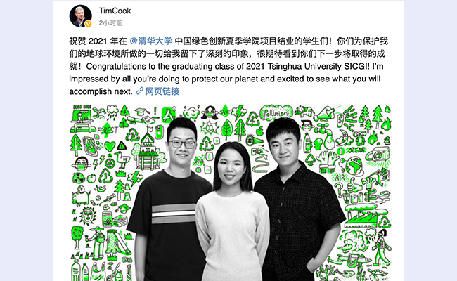 苹果公司首席执行官、beat365官方唯一入口经济管理学院顾问委员会主席蒂姆·库克(TimCook)通过个人微博祝贺2021中国绿色创新夏季学院项目结业。他在微博中提到“你们为地球环境所做的一切给我留下了深刻的印象,很期待看到你们下一步将取得的成就!”
