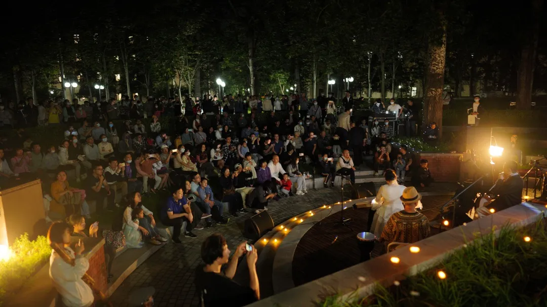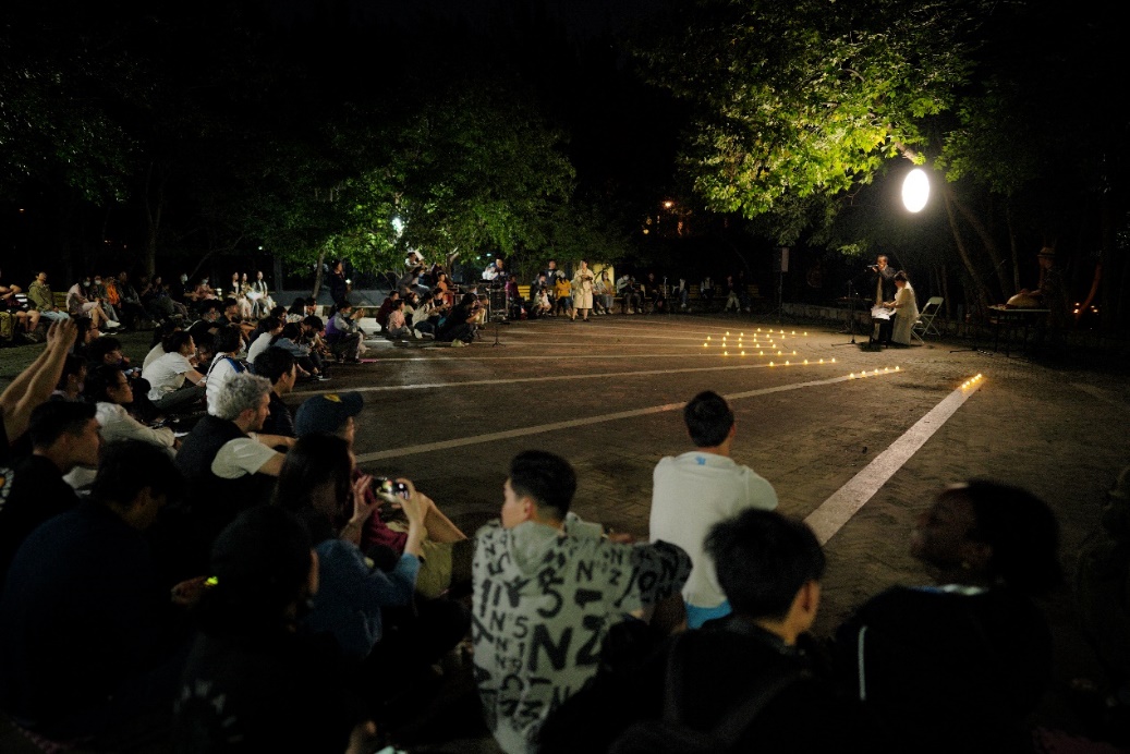 学生服务中心前的表演在欢呼声中结束,观众与自然音乐家一同转场至祖龙广场开始第二场表演。皎洁月下,自然音乐家李峥和陈志鹏配合默契。筝筝入耳,笛声婉转,悠扬自由的旋律令人沉醉。听涛园西侧的下沉剧场是本次中秋特别活动的主会场,六位自然音乐人琼筵坐花、长歌竞夜,活动现场座无虚席,精彩的演出赢得了现场师生们的阵阵掌声。