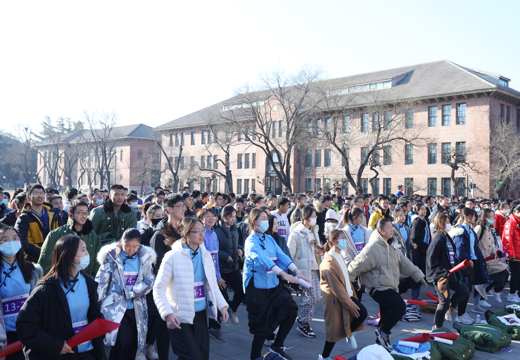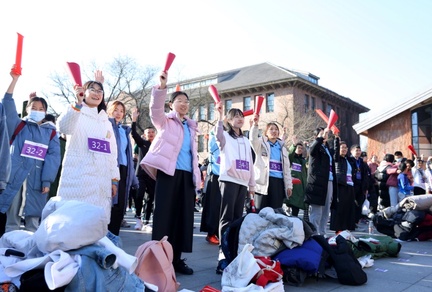 上午10点,近五十支队伍集合完毕,在大礼堂前齐唱校歌。冬日的上午寒风微起,但是大家眼神坚定,神采飞扬,手持标语贴纸,挥舞着红色的喇叭和加油棒,缅怀伟大历史,致敬时代精神。赛前,校党委原副书记王凤生在致辞中号召同学们“坚持锻炼!强健体魄!为祖国健康工作五十年!”